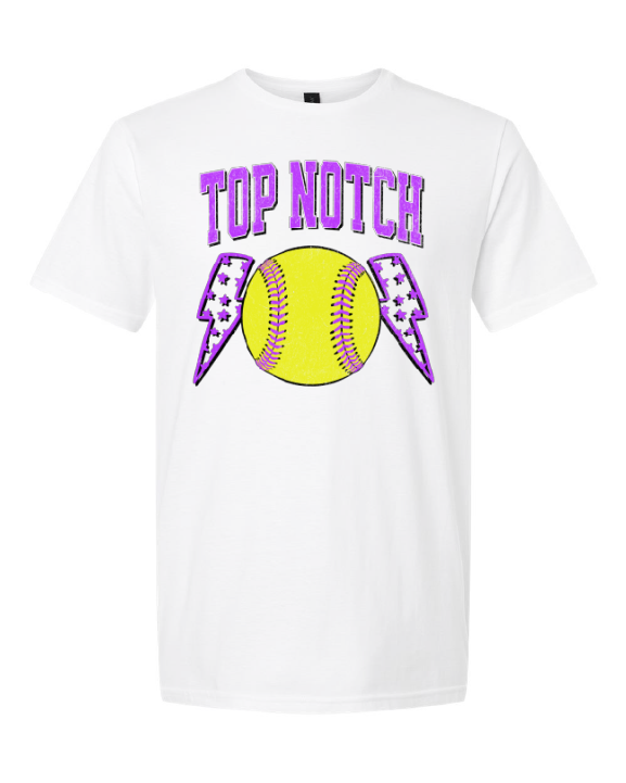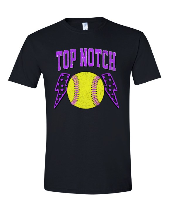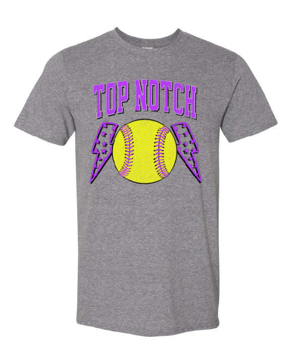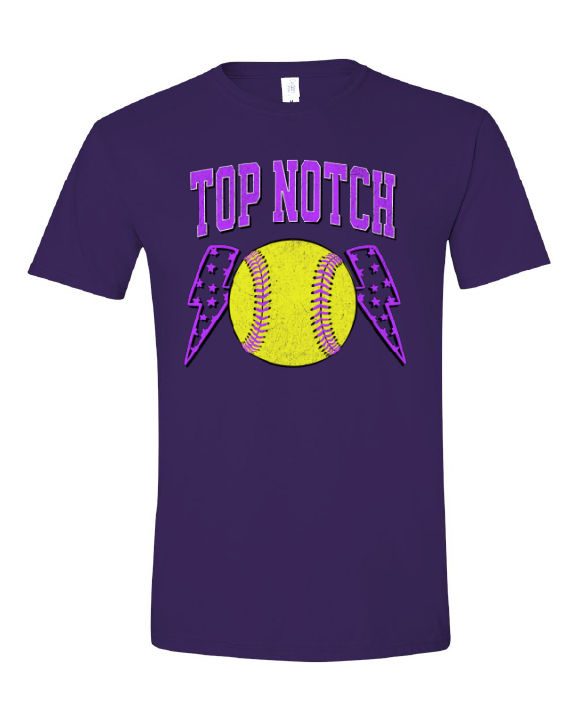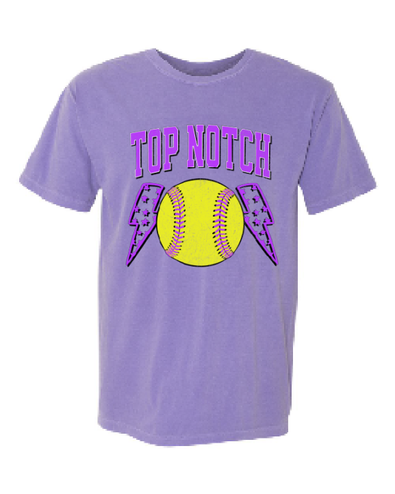 Top Notch Softball Short Sleeve distressed Purple Bolt. (Neon Violet and Violet are Comfort Colors)